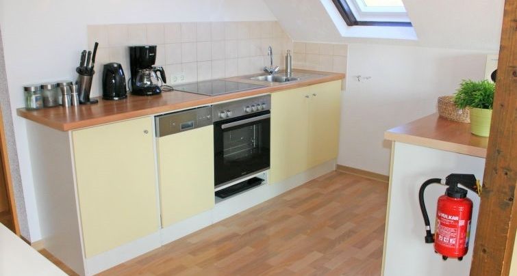 - Küche mit 4 Keramikkochfelder, Kühlschrank, Backofen, Geschirrspüler und Kaffeemaschine
