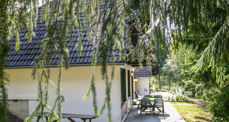Das 6 Personen Ferienhaus mit einer Fläche von ca. 75 m2 ist modern und mit viel Holz eingerichtet. Im Erdgeschoss finden Sie das Wohnzimmer mit TV und offener Küche mit 4-Flammen-Keramikofen, Backofen, 4 Keramikkochfelder, Geschirrspüler und Mikrowelle. Hier finden Sie auch ein Schlafzimmer, das Badezimmer und eine separate Toilette. Im Obergeschoss befinden sich 2 Schlafzimmer und eine kleiner Balkon. Sie können eine große, teilweise überdachte Terrasse mit Möbeln und einem Grill nutzen. Das Haus ist rauchfrei und maximal 2 Haustiere sind erlaubt. Das Ferienhaus hat Klimaanlage.