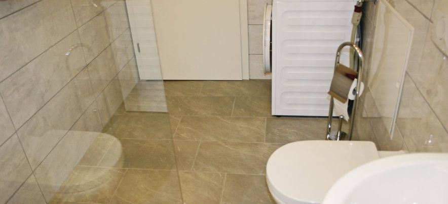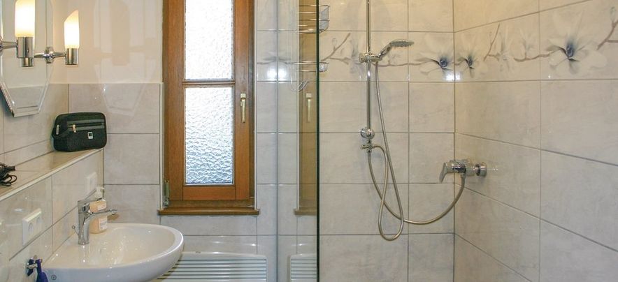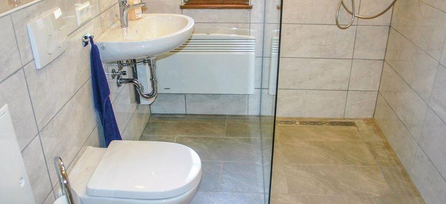 - Badezimmer mit Dusche, Toilette und Waschtisch