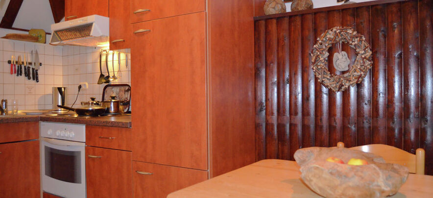 - Küche mit 4 Keramikkochfelder, Kühlschrank, Backofen, und Kaffeemaschine