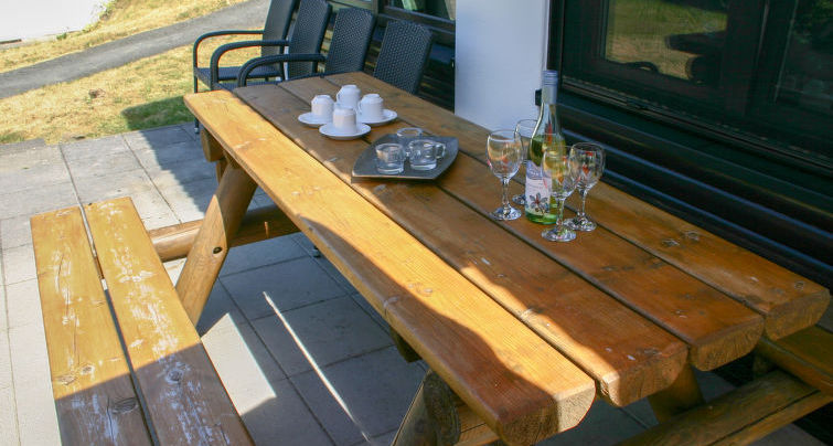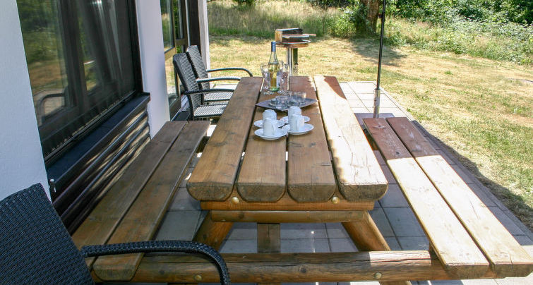 Das 6 Personen Ferienhaus mit einer Fläche von ca. 75 m2 ist modern und mit viel Holz eingerichtet. Im Erdgeschoss finden Sie das Wohnzimmer mit TV, Klimaanlage und offener Küche mit 4-Flammen-Keramikofen, Backofen, 4 Keramikkochfelder, Geschirrspüler und Mikrowelle. Hier finden Sie auch ein Schlafzimmer, das Badezimmer und eine separate Toilette. Im Obergeschoss befinden sich 2 Schlafzimmer und eine kleiner Balkon. Sie können eine große, teilweise überdachte Terrasse mit Möbeln, Waschmaschine und einem Grill nutzen. Das Haus ist rauchfrei.