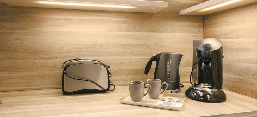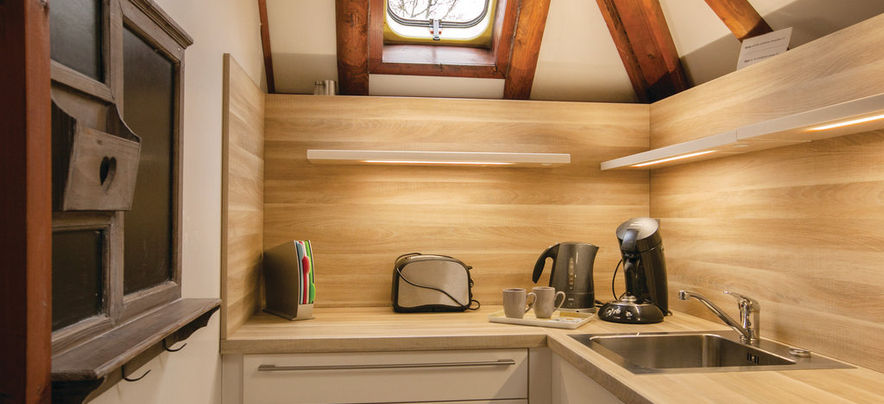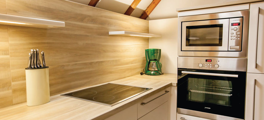 - Küche mit 4 Keramikkochfelder, Kühlschrank, Backofen, Mikrowelle und Kaffeemaschine